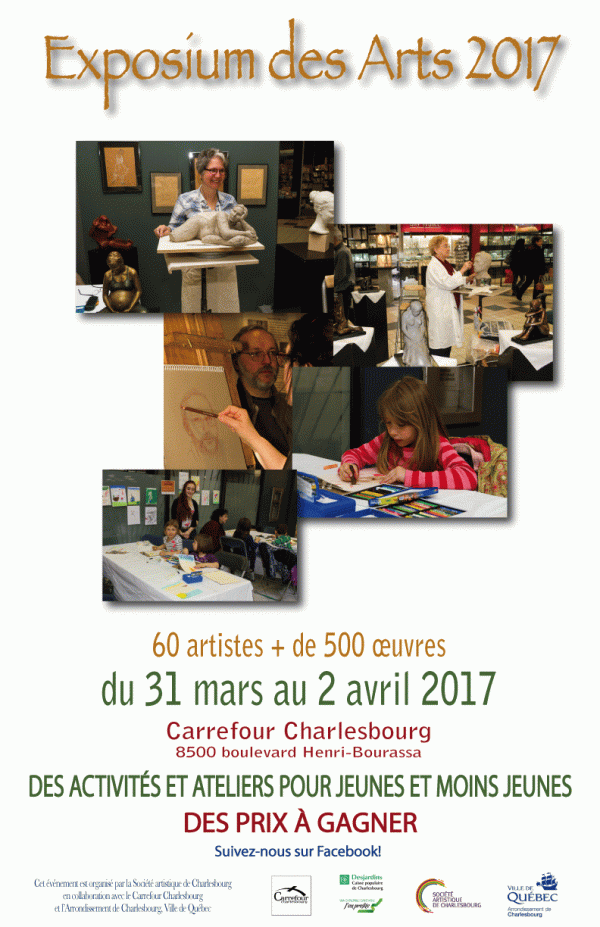 C’est ce week-end que se tient notre «Exposium des arts 2017» au Carrefour Charlesbourg, 8500, boul. Henri-Bourassa, Québec. Une soixante d’artistes de diverses disciplines vous y attendent à compter de vendredi midi jusqu’à dimanche en fin de journée. Il y a un concours de dessin pour les jeunes et des prix à gagner. On vous…