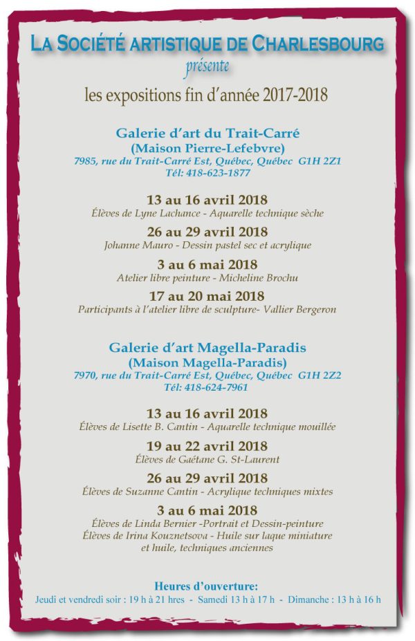 Nous vous proposons la lecture de notre nouvelle édition des Racont’arts pour le mois de novembre 2018. RENDEZ-VOUS DANS LA SECTION RACONT’ARTS POUR CONSULTER CETTE ÉDITION AINSI QUE NOS ARCHIVES. Bonne lecture et merci de participer au rayonnement de la Société artistique de Charlesbourg !